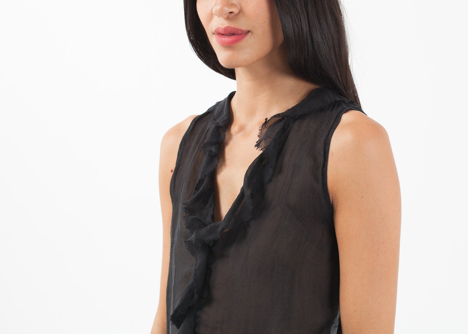 Soft ruffling frames the neck in the Fair Top. Delicate and poised. Pip-Squeak Chapeau. V-neckline. Color Black. 100% Organza. Made in U.S.A. Ashley is wearing a Small.
